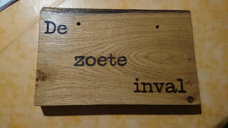 Een massief eikenbord a4 formaat voor buiten (geïmpregneerd en gebeitst) , met `` de zoete inval`` .